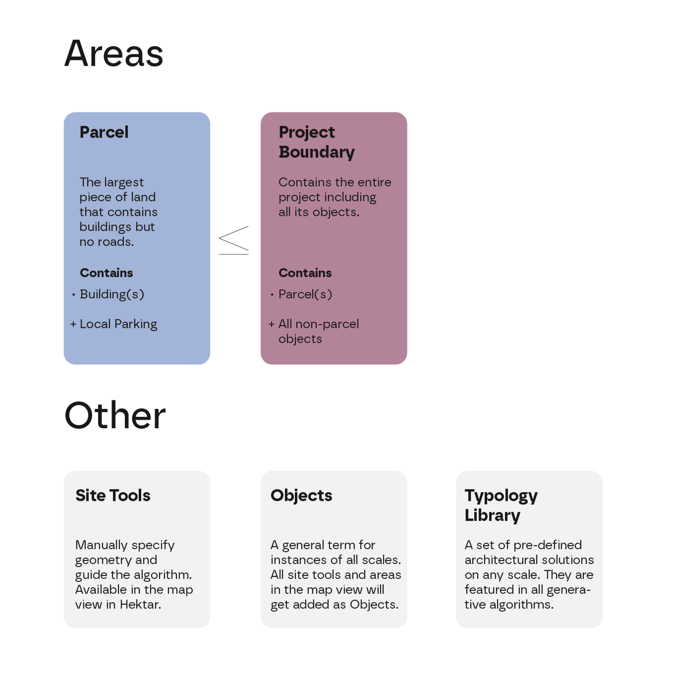 In Hektar, terminology spans multiple architectural scales. This section is an overview what architectural scales each term contains.
