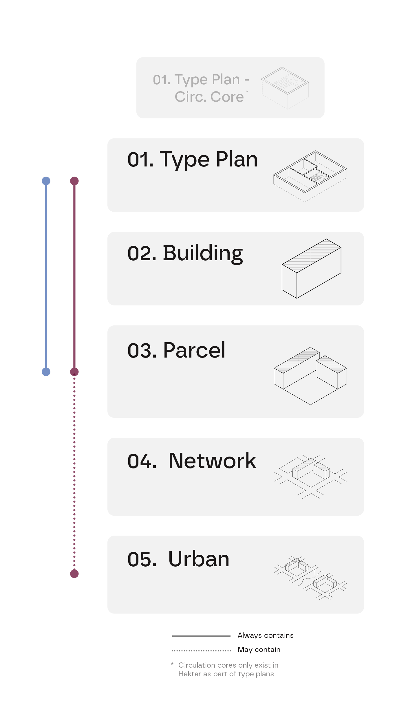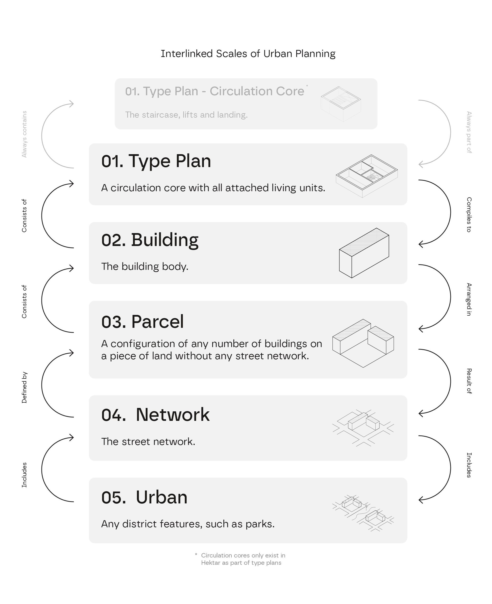 The units in the following chart all exist as interlinked entities in Hektar - the first three ones with extensive libraries of typologies on each level. Please refer to Type plan Typologies, Building Typologies and Parcel Typologies for more details.